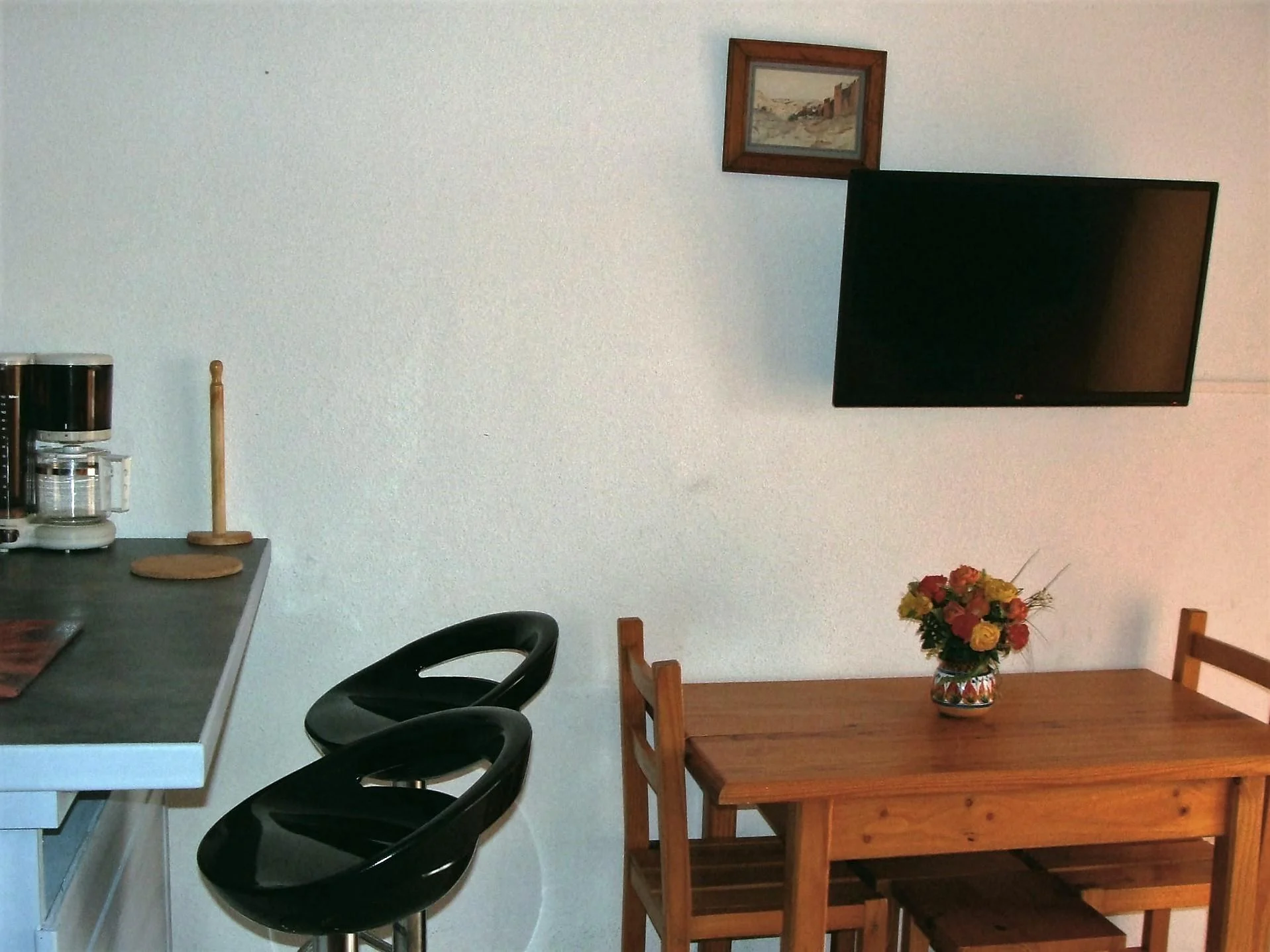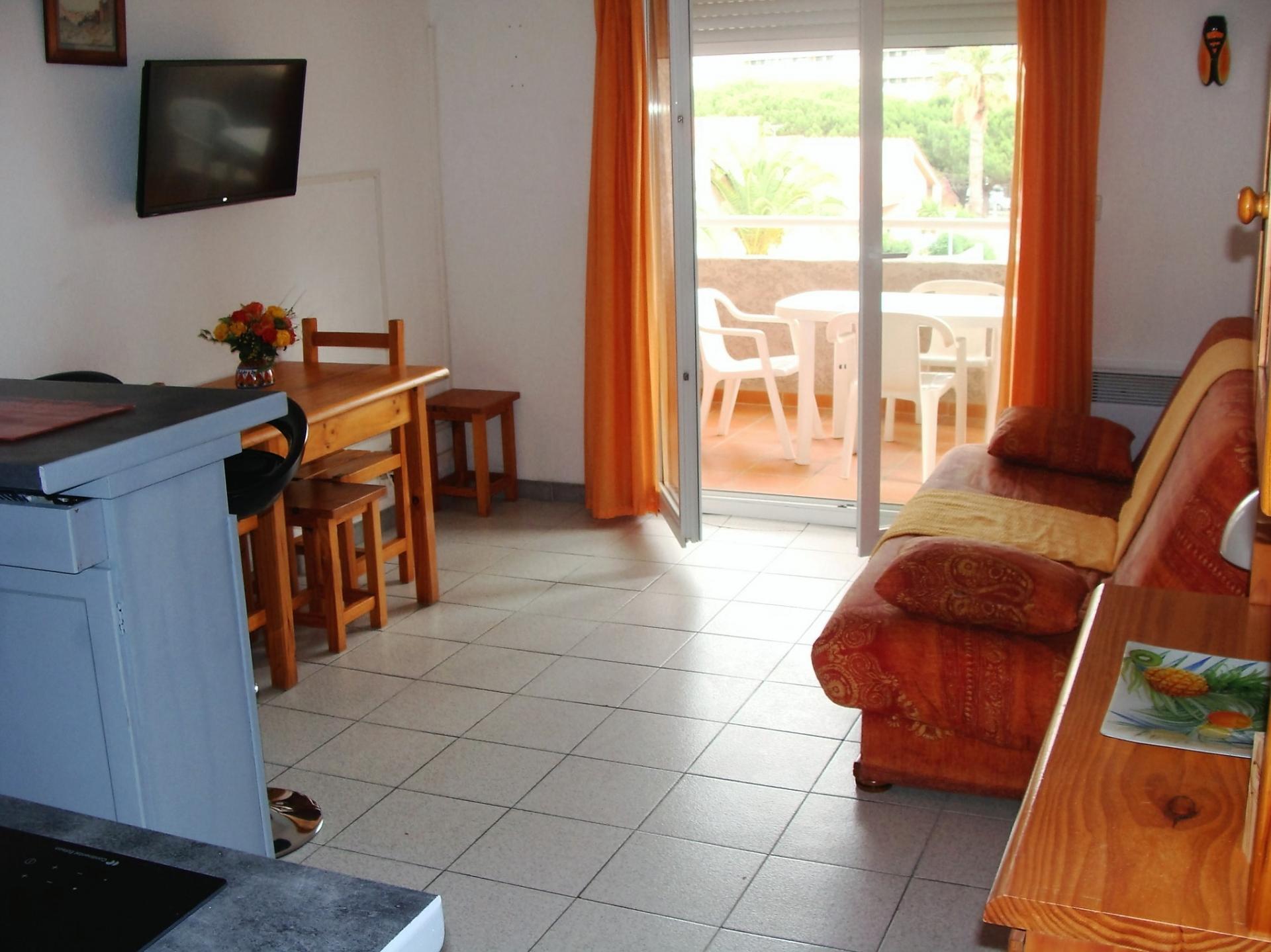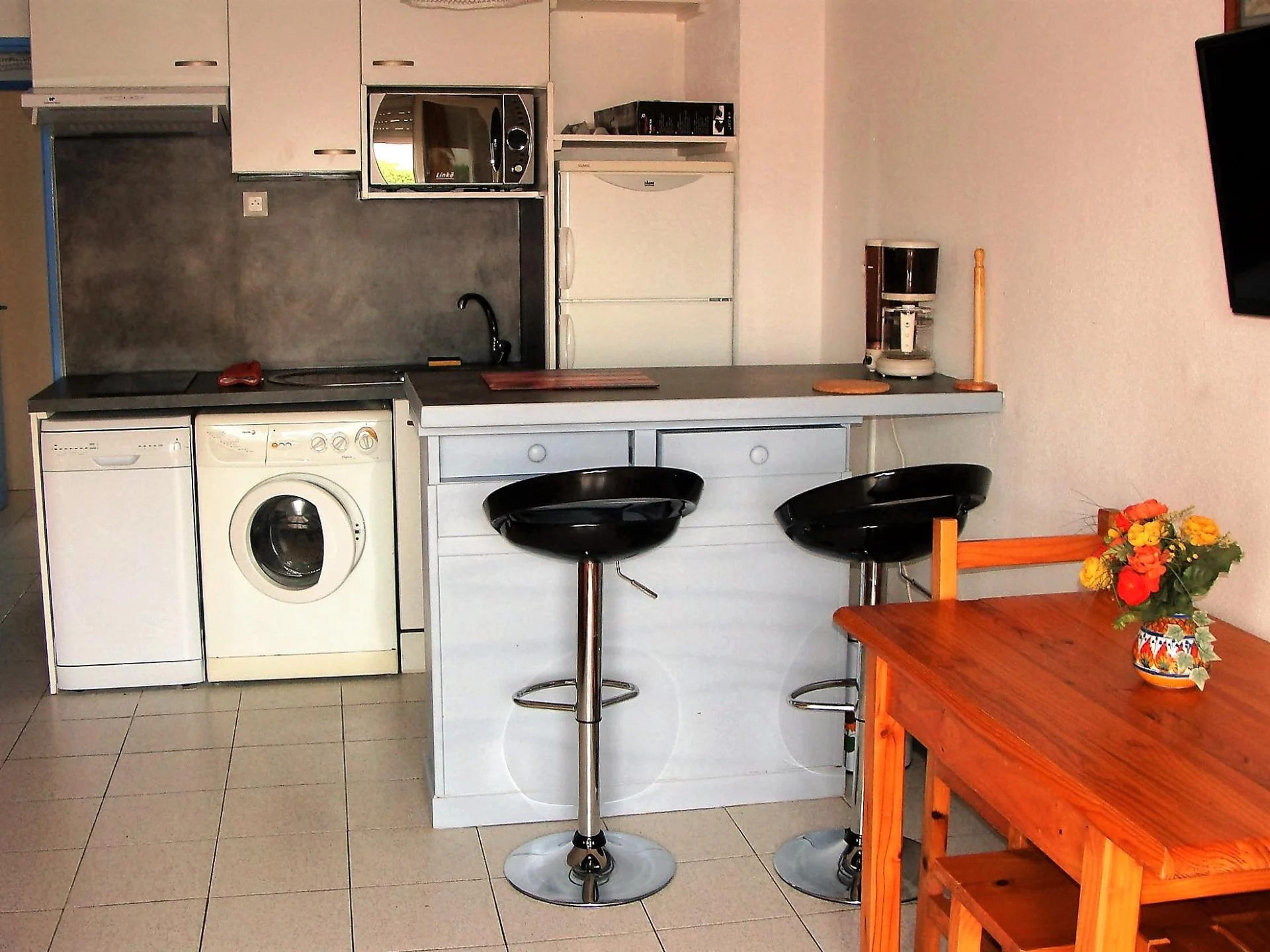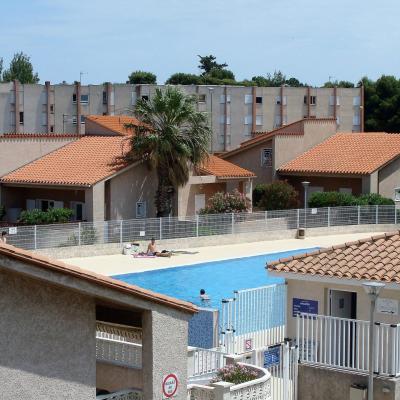 L'appartement se trouve au deuxième étage du bâtiment de la résidence. Depuis la terrasse couverte du séjour, on voit les plages de la piscine et la mer en perspective. Le séjour est équipé d'un canapé permettant le couchage de deux personnes (couchage en 140). L'espace repas du séjour est séparé du coin cuisine par un bar passe-plat. Il dispose également d'un table basse, d'une TV et d'une commode. Le coin cuisine est équipé d'un lave-vaisselle, d'un lave-linge, d'un réfrigérateur avec congélateur, de plaques vitrocéramiques, d'un four multifonction (micro-ondes et grilloir), d'une cafetière électrique, d'un grille-pain, d'une bouilloire électrique, d'une plancha électrique ainsi que de toute la vaisselle nécessaire.
