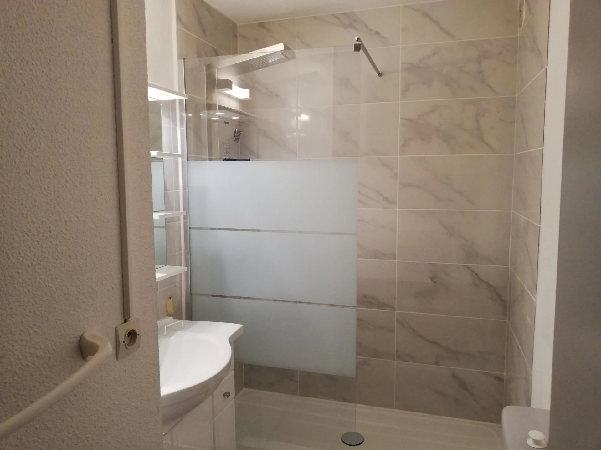 La salle de bains est équipée d'une grande douche italienne. Les WC sont dans la salle de bains.