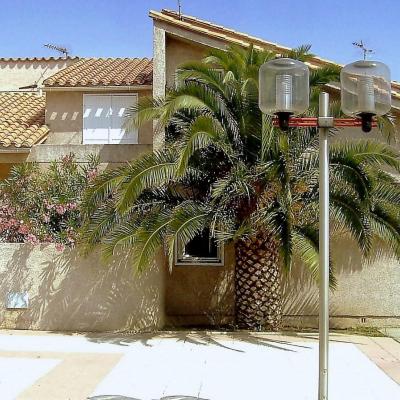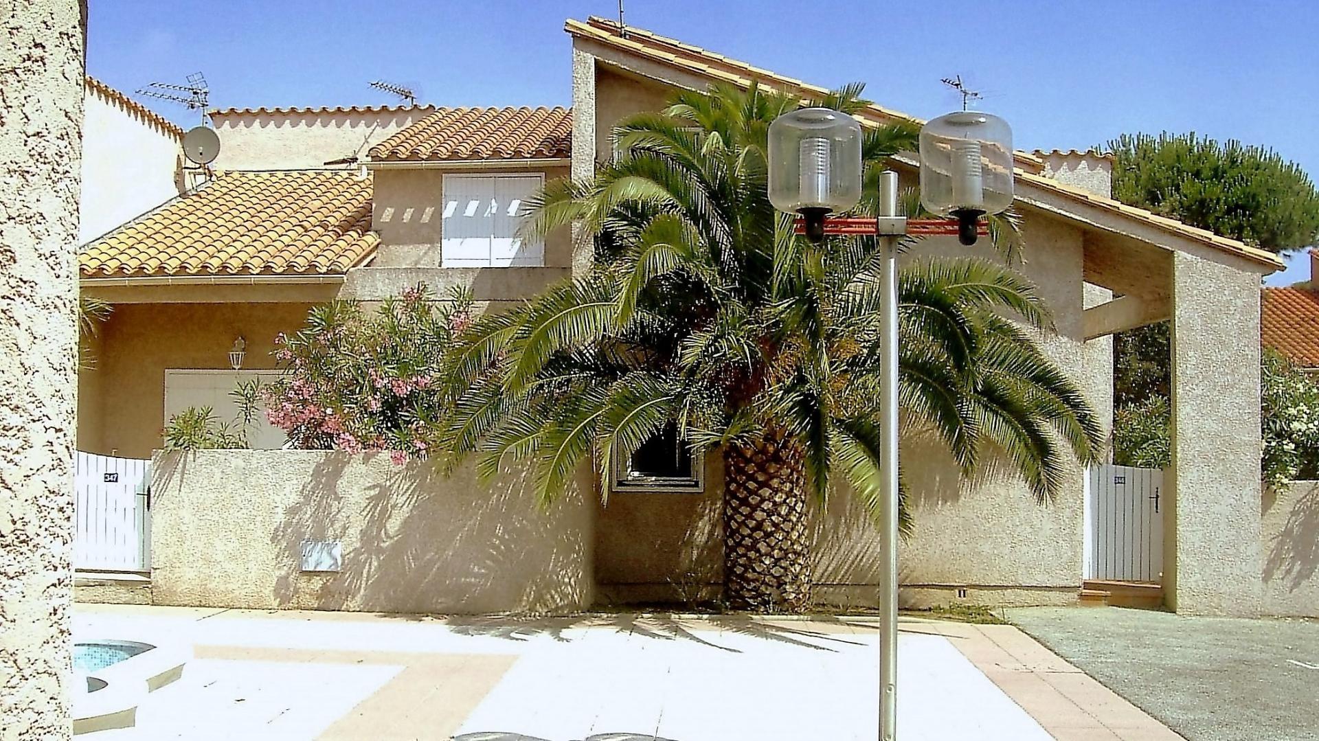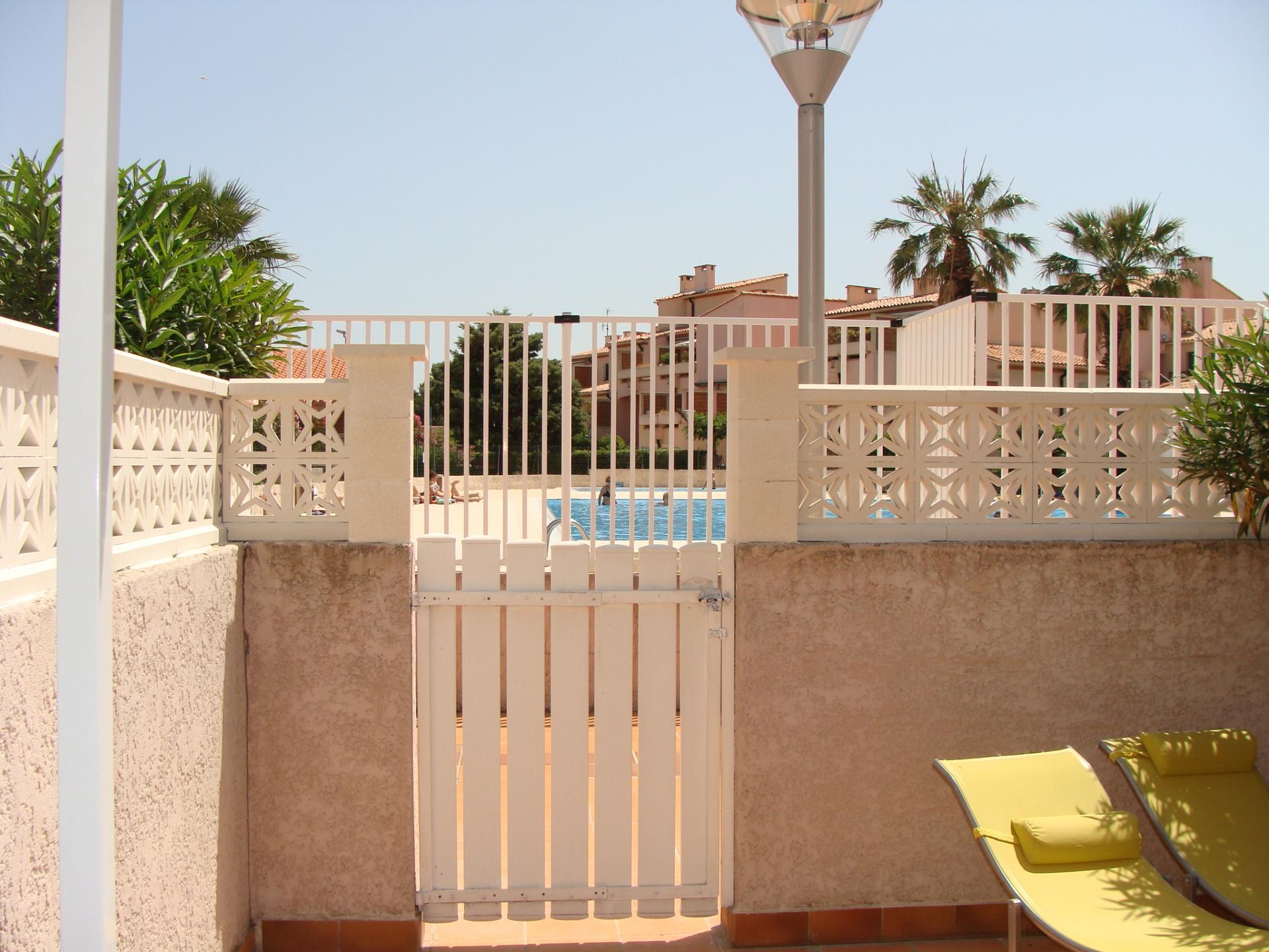 L'appartement se trouve face à la piscine de la résidence. Le patio du séjour ouvre sur l'allée qui longe la piscine. Il est équipé d'un grand store double pente, d'un barbecue Weber, de transats et d'un salon de jardin.